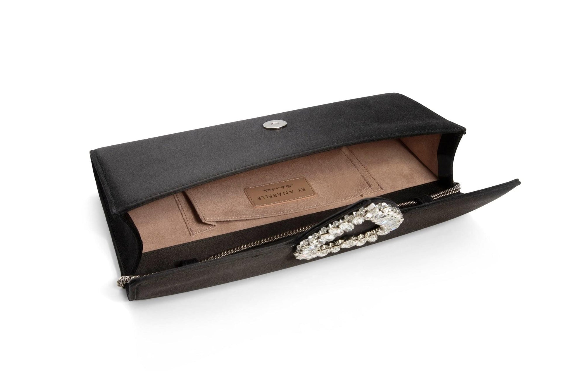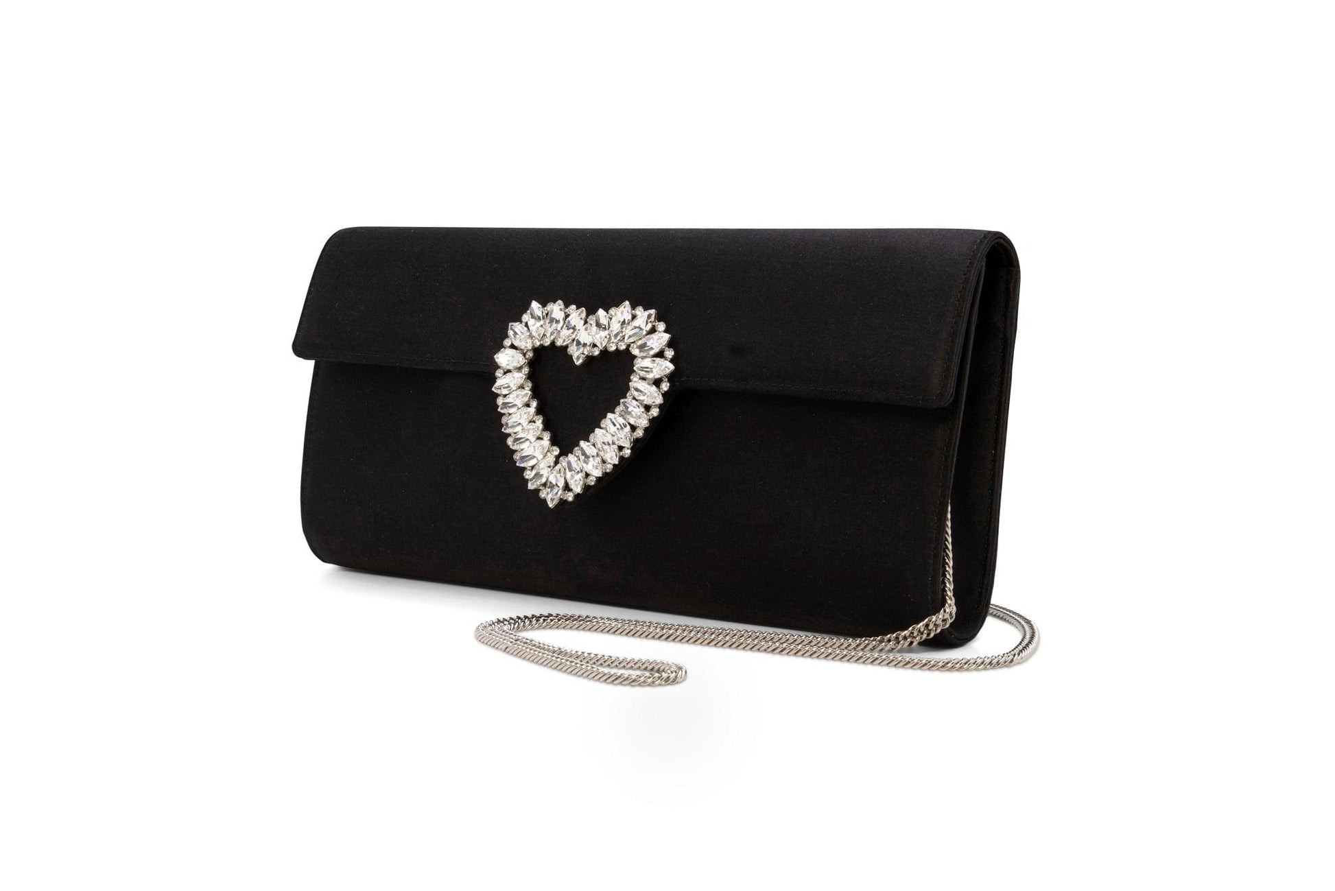 The Amor clutch features the signature “Couer”, a heart embellished with Swarovski stones in black silk satin with a removable thin double metal chain strap.