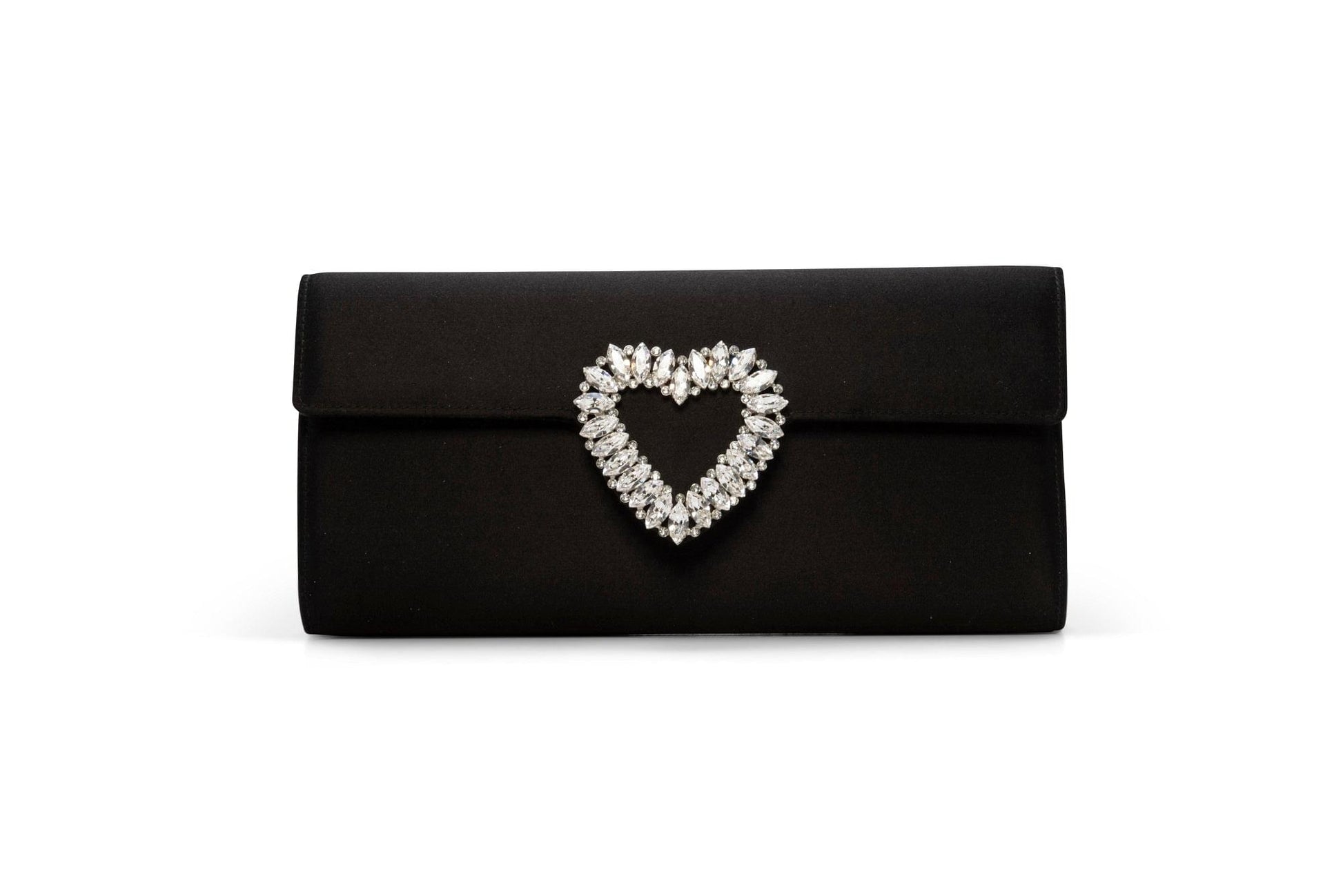 Black silk satin and Swarovski heart embellishment buckle / dimensions: 27 X 13 cm / signature leather label / Made in Italy