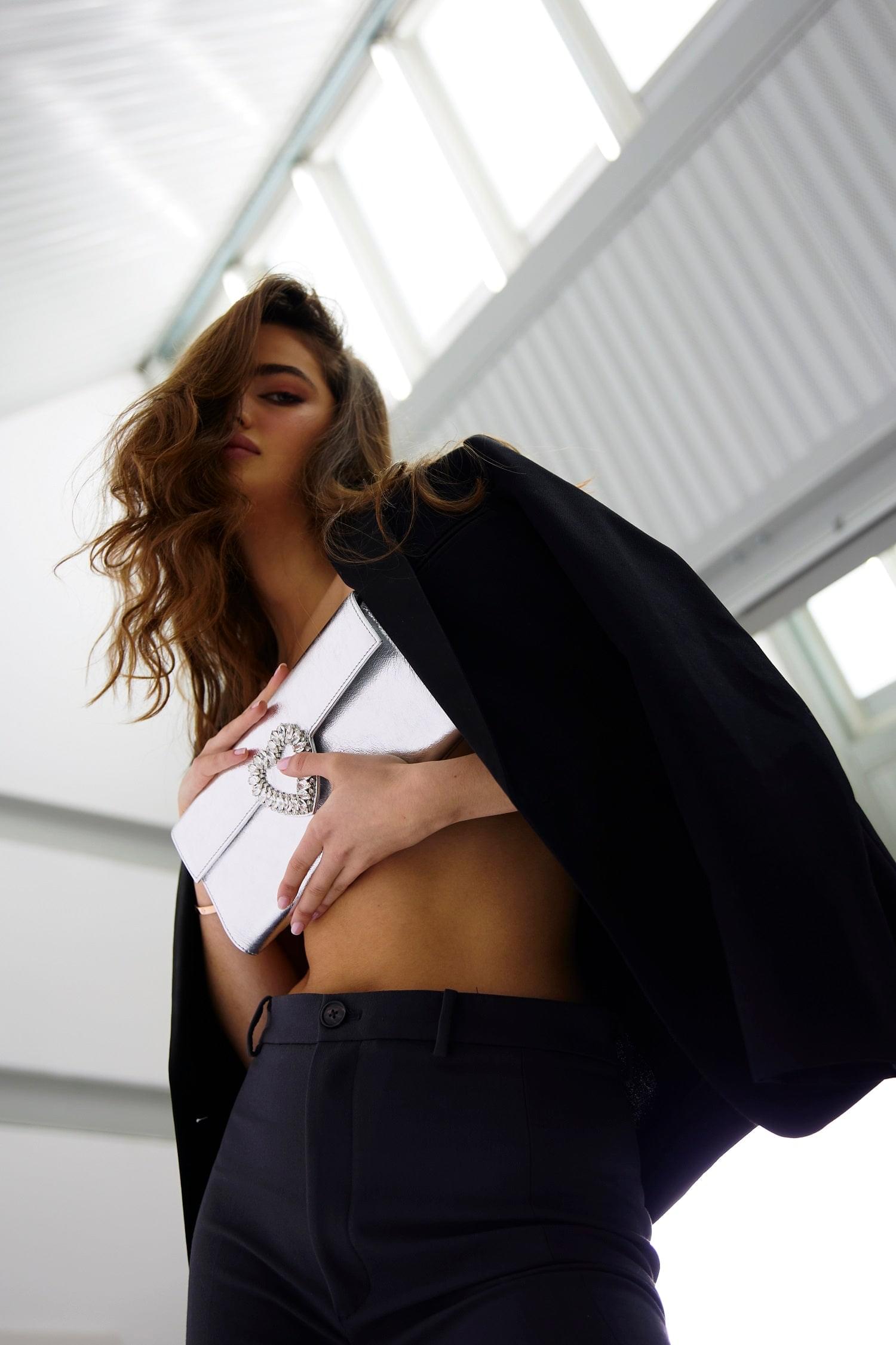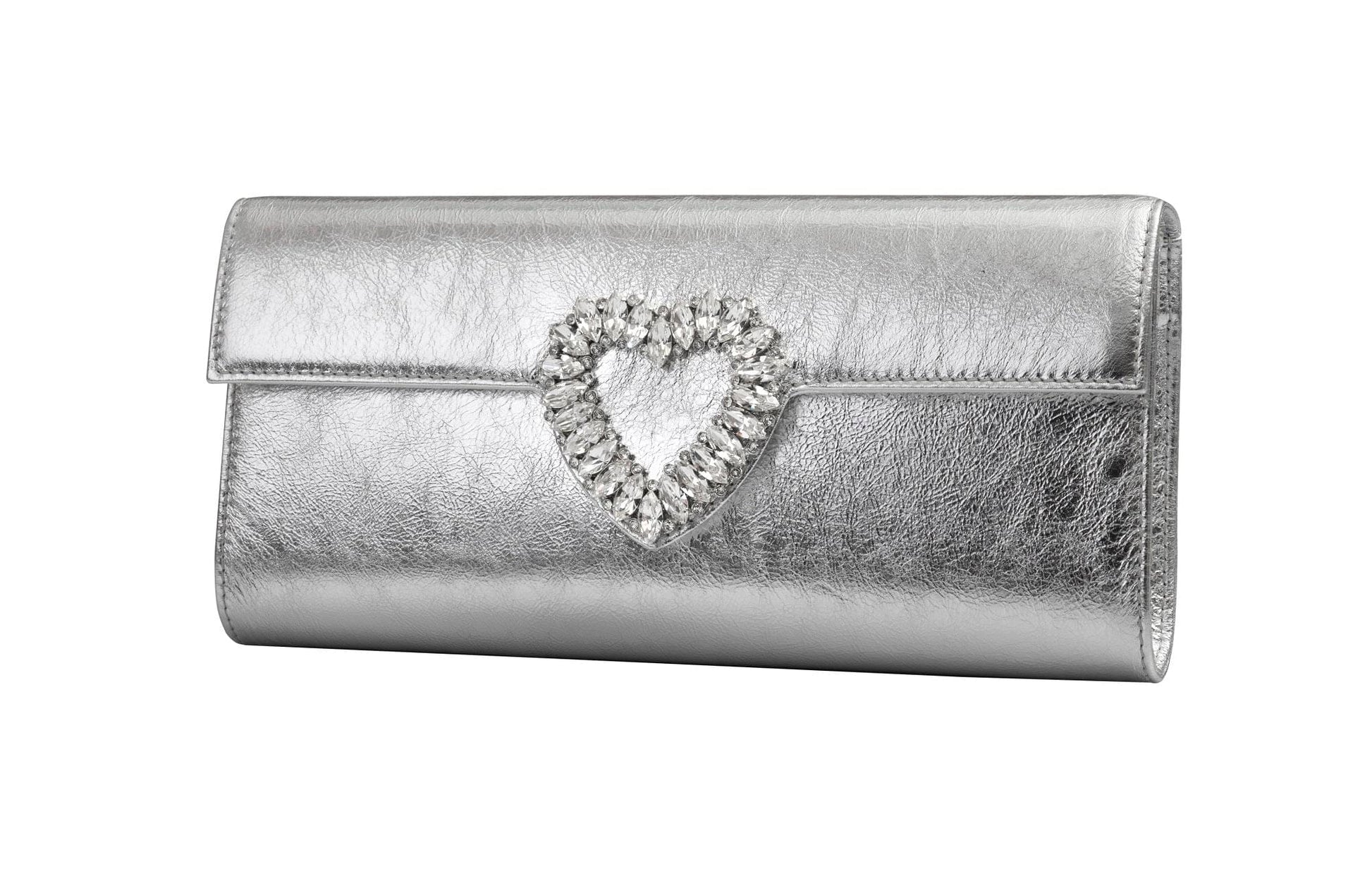 The Amor clutch features the signature “Couer”, a heart embellished with Swarovski stones in silver nappa with a removable thin double metal chain strap.
