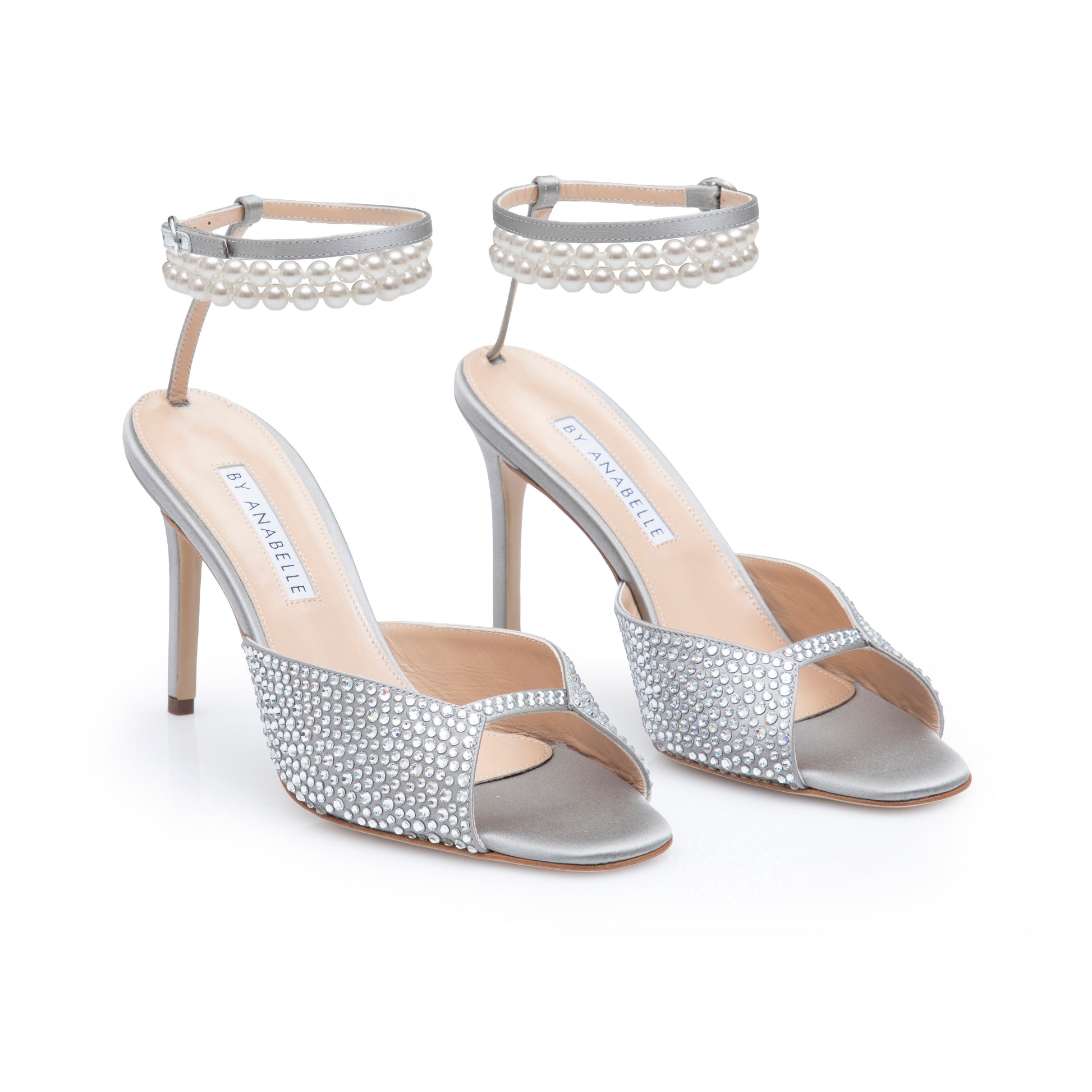 sI over silk and light silk crystal embellishment with double pearl bracelet / leather sole / leather insole / signature A logo / Heel height: approximately 8.5cm / Italian Fit / True to size
