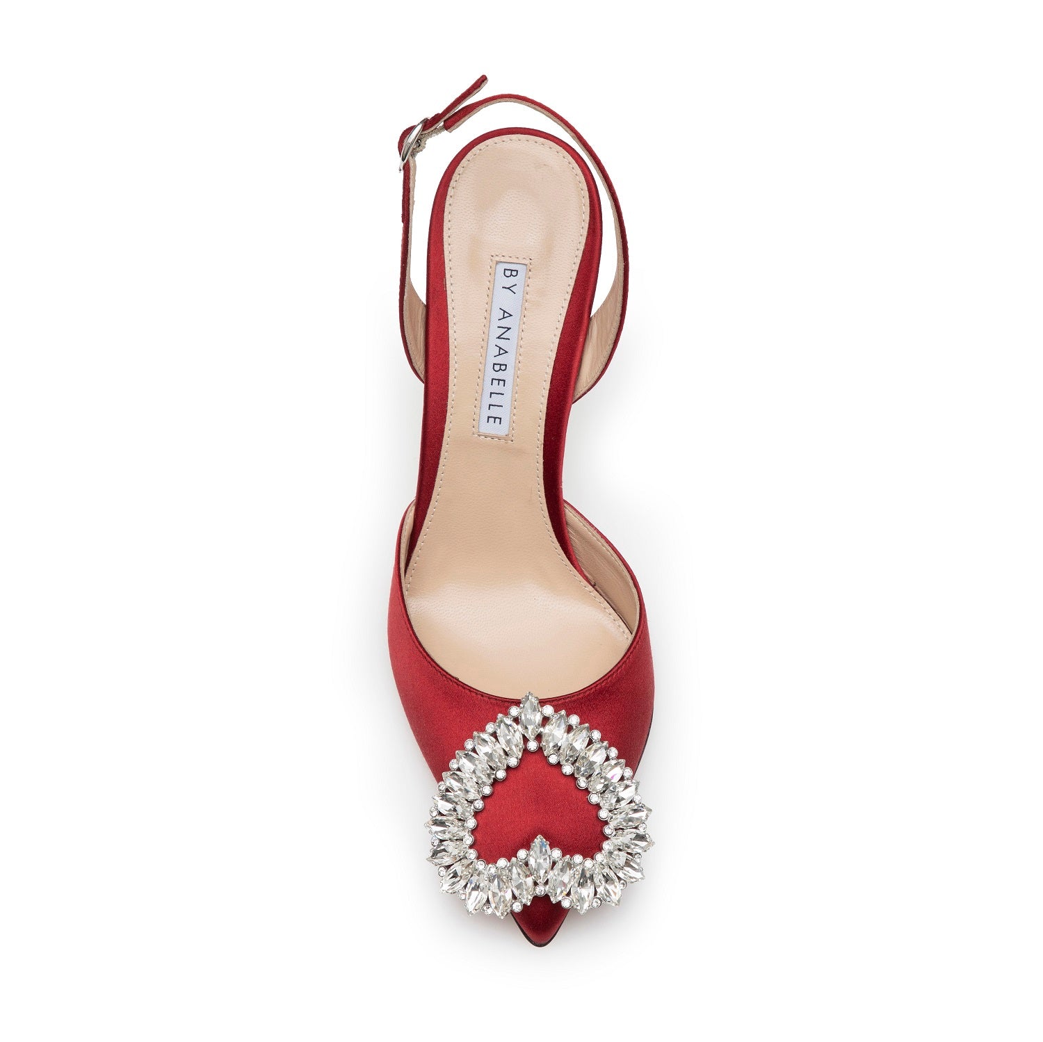 The Amor slingback features the signature “Couer,” a heart embellished with Swarovski stones in rich Bordeaux silk satin, and an adjustable strap.