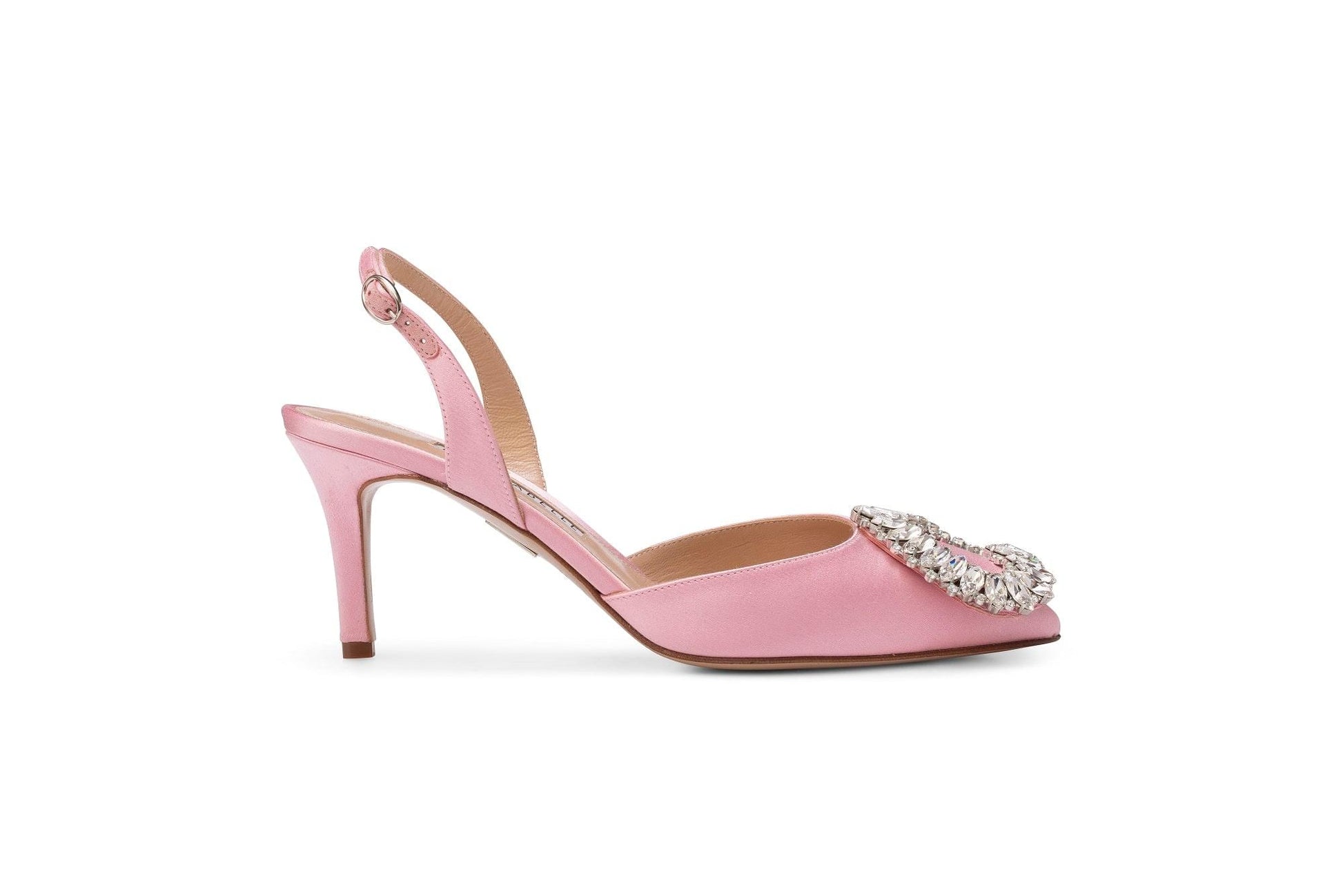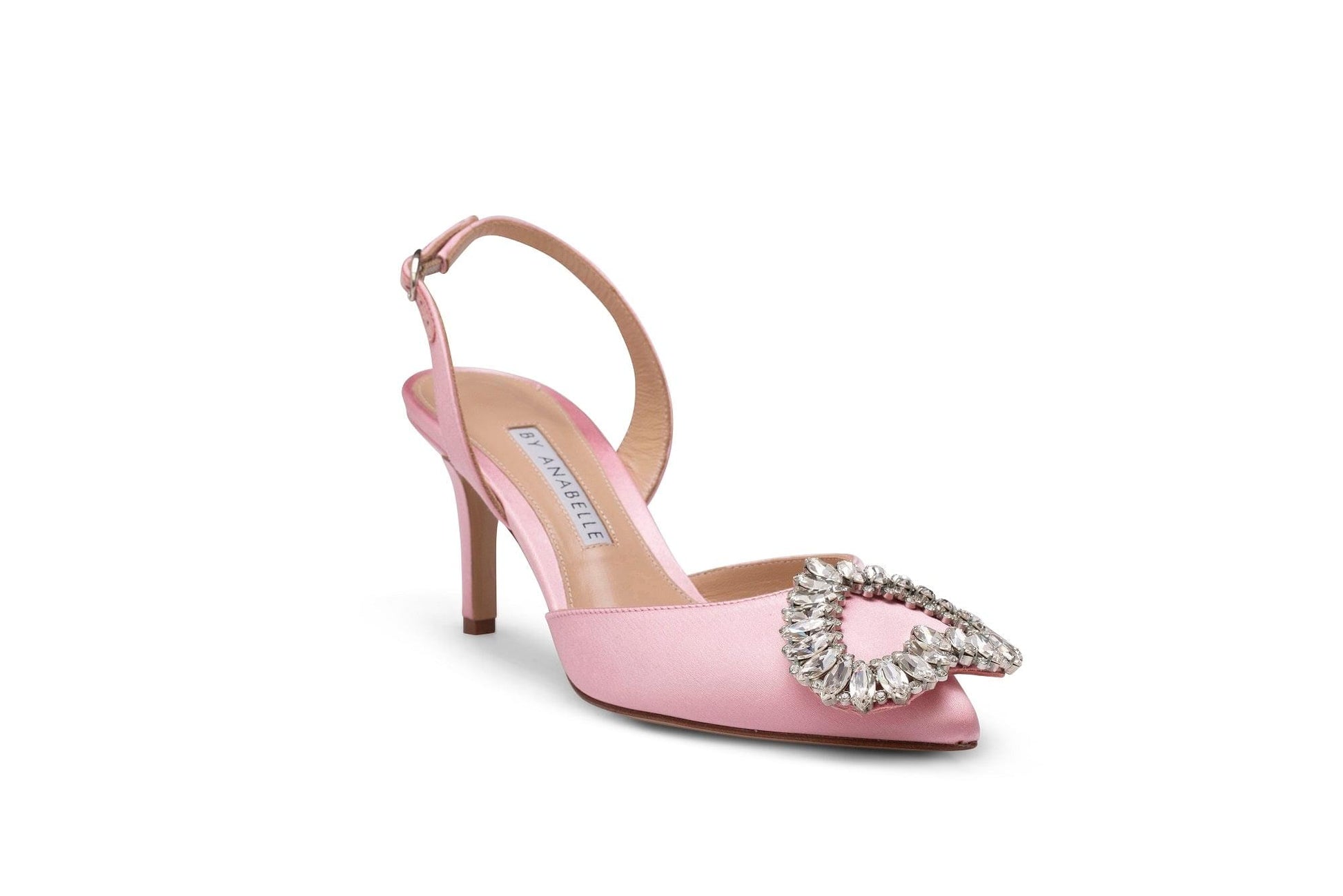 The Amor slingback features the signature “Couer”, a heart embellished with Swarovski stones in baby pink silk and an adjustable slingback.