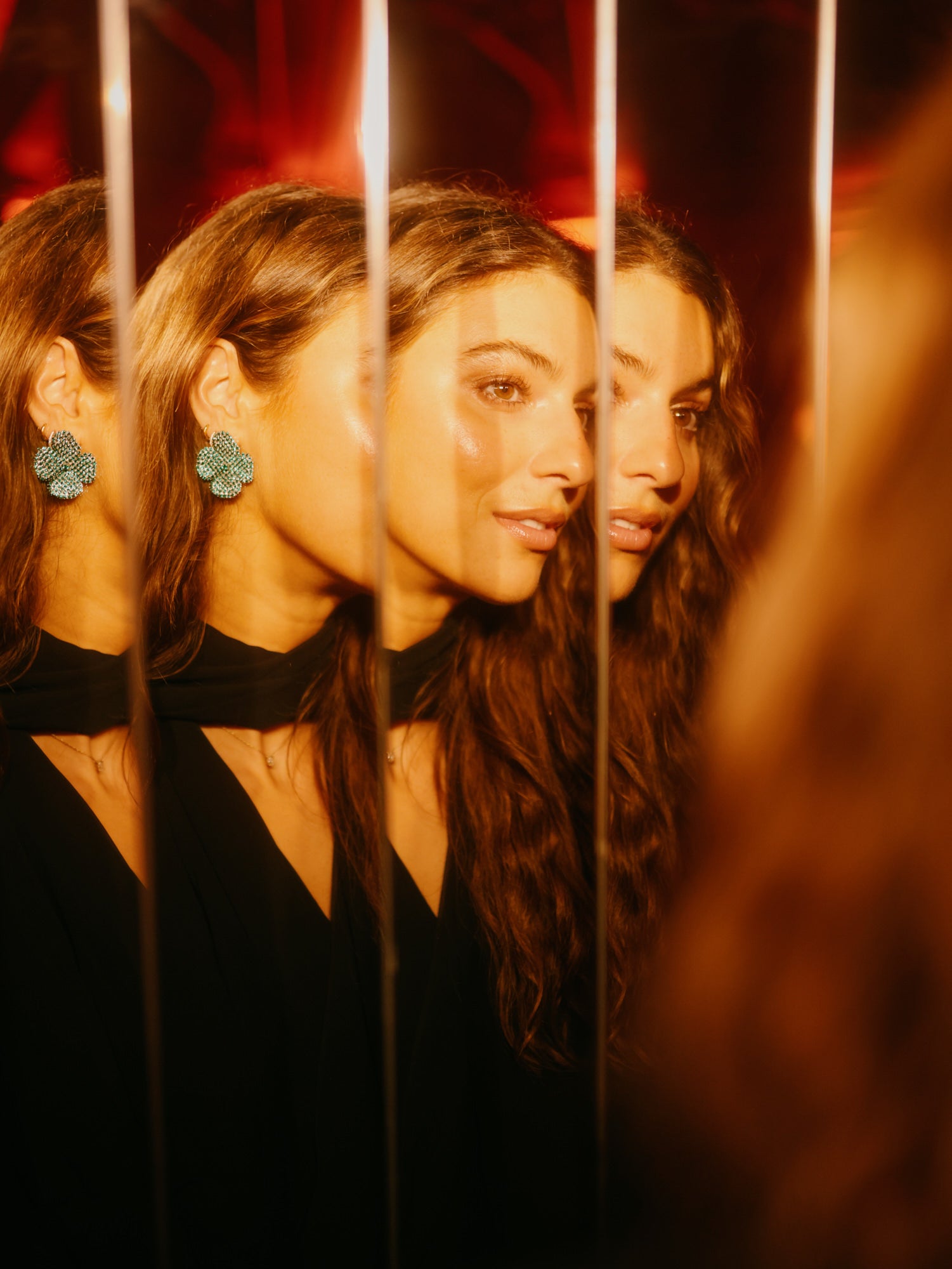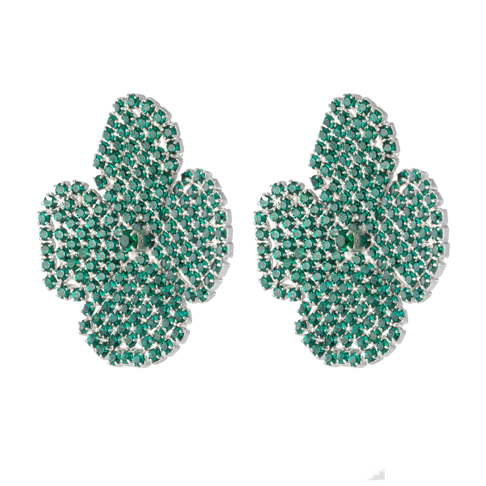 Each earring features our signature four-petal silhouette, sculpted in shimmering pavé crystals that catch the light from every angle. luminous emerald stones for a vibrant burst of colour.