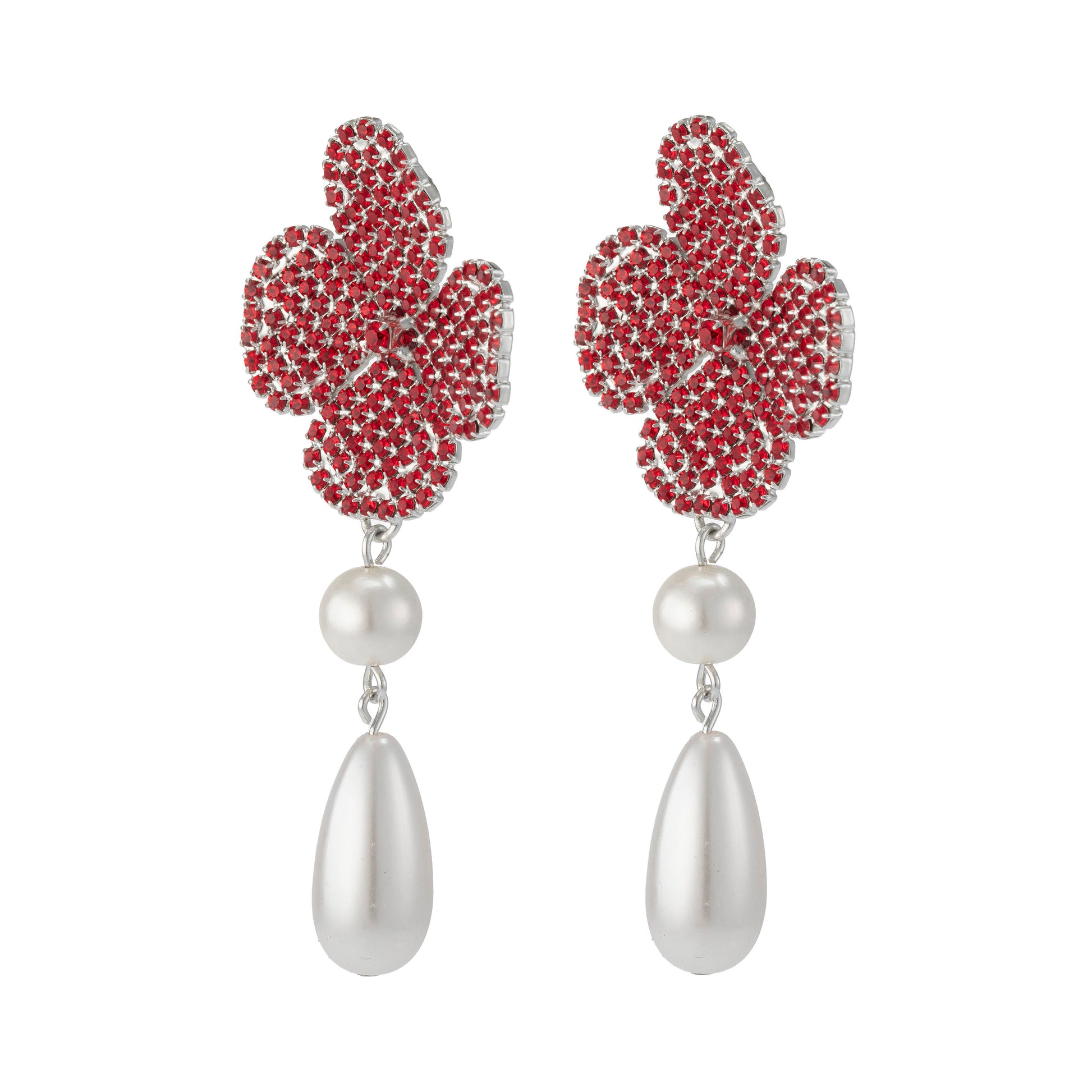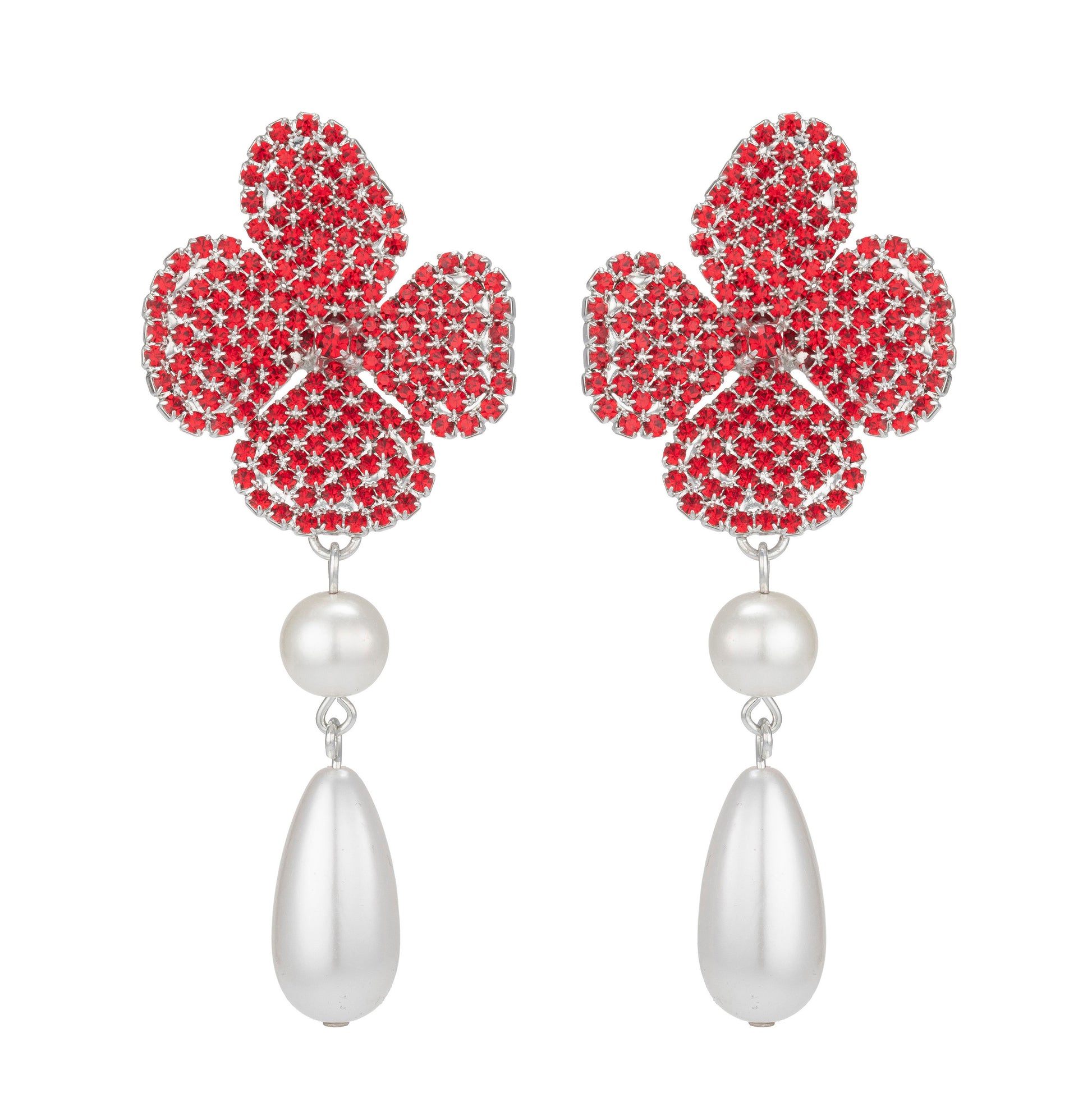 Each earring features our signature four-petal silhouette, sculpted in shimmering pavé crystals that catch the light from every angle. rich ruby for a vibrant burst of colour and finished with an oversized pearl drops that sway gracefully with movement—adding both drama and elegance.
