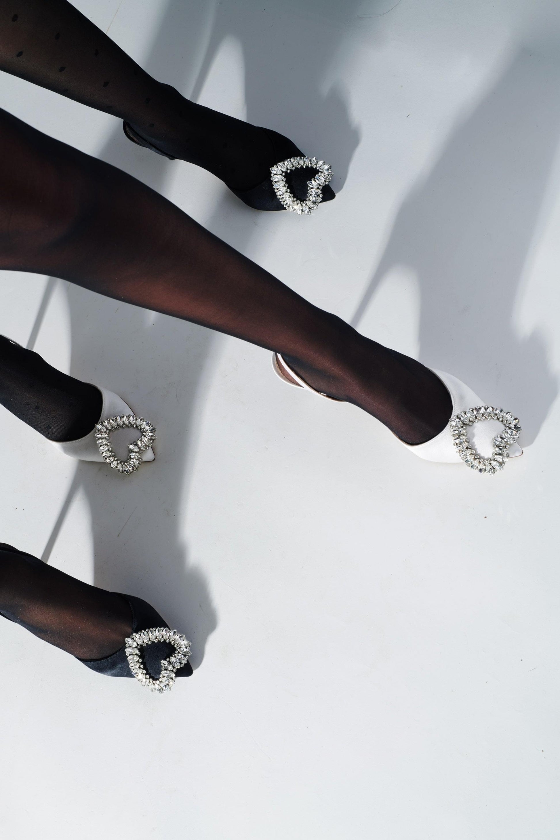 The Amor slingback features the signature “Couer”, a heart embellished with Swarovski stones in black silk satin and an adjustable slingback.