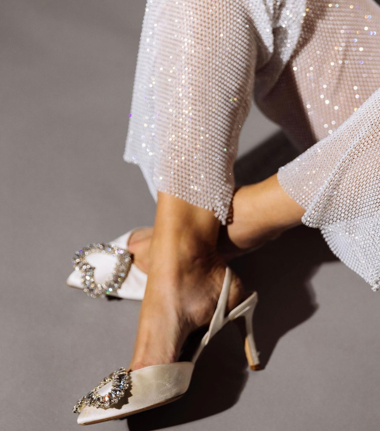 White silk satin and Swarovski heart embelishment / leather sole / leather insole / signature A logo / Heel height: approximately 6.5cm / Italian Fit / True to size