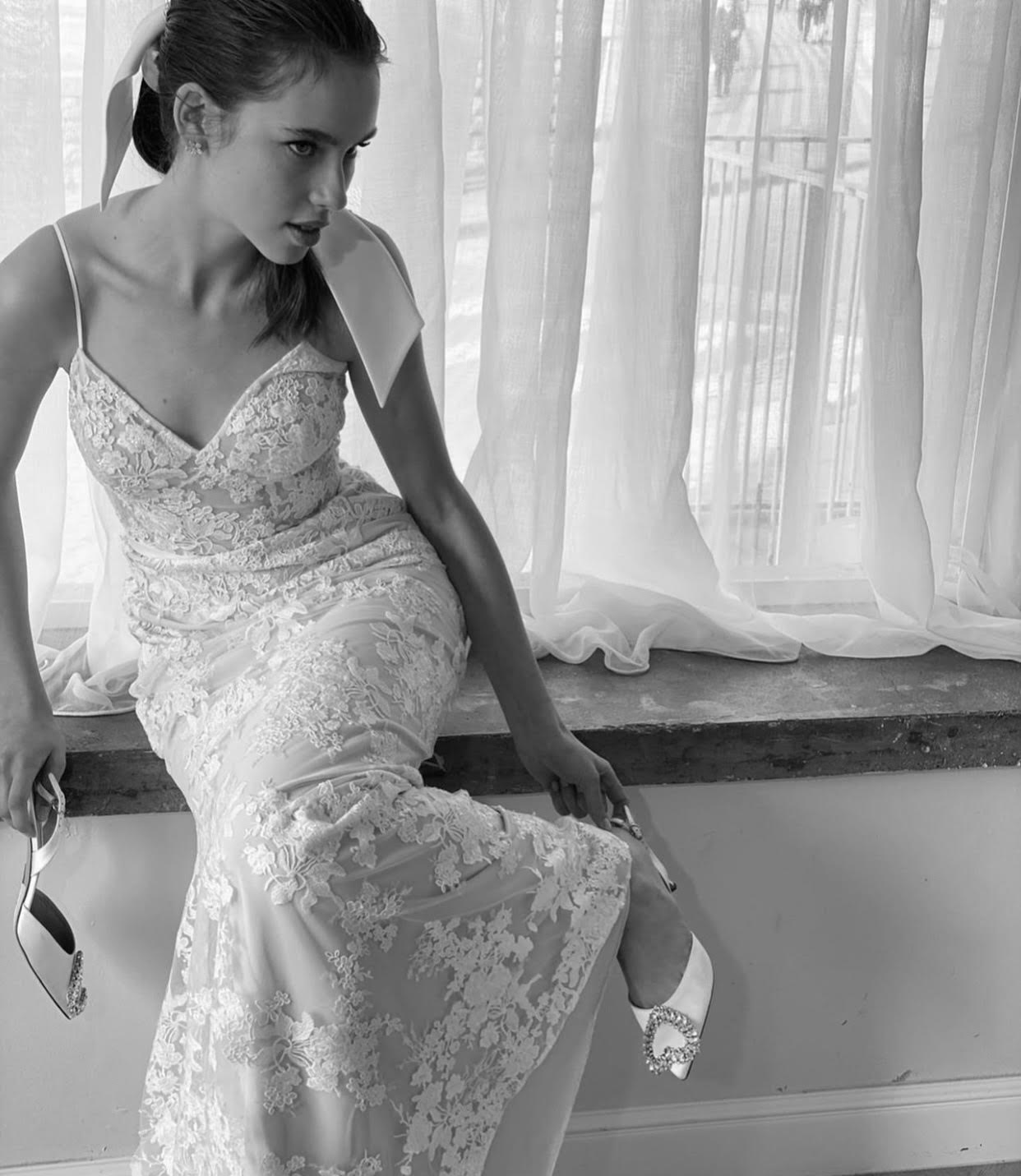 The Amor slingback features the signature “Couer”, a heart embellished with Swarovski stones in white silk satin and an adjustable slingback.