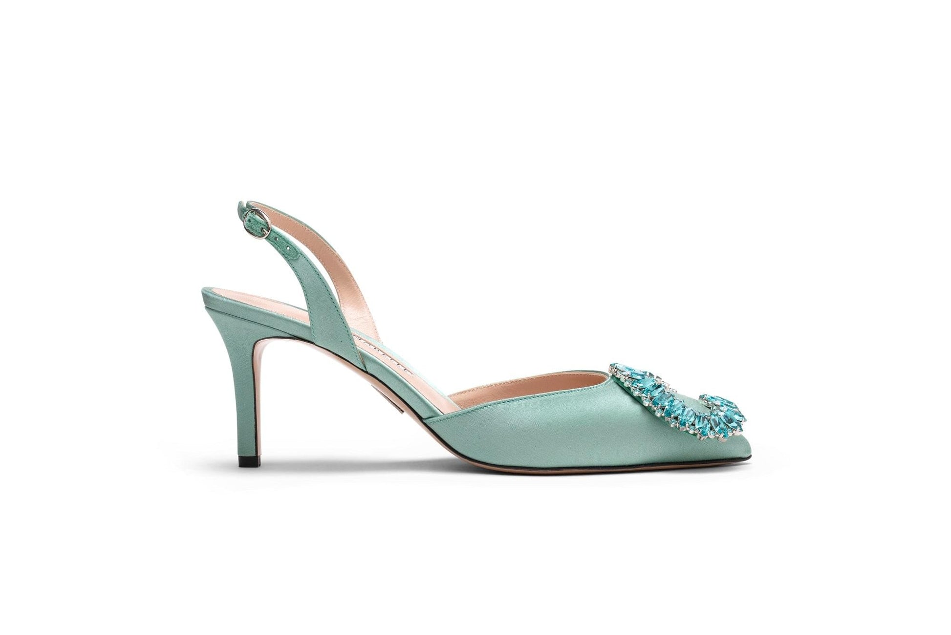 Turquoise silk with matching Swarovski heart embelishment / leather sole / leather insole / signature A logo / Heel height: approximately 6.5cm / Italian Fit / True to size