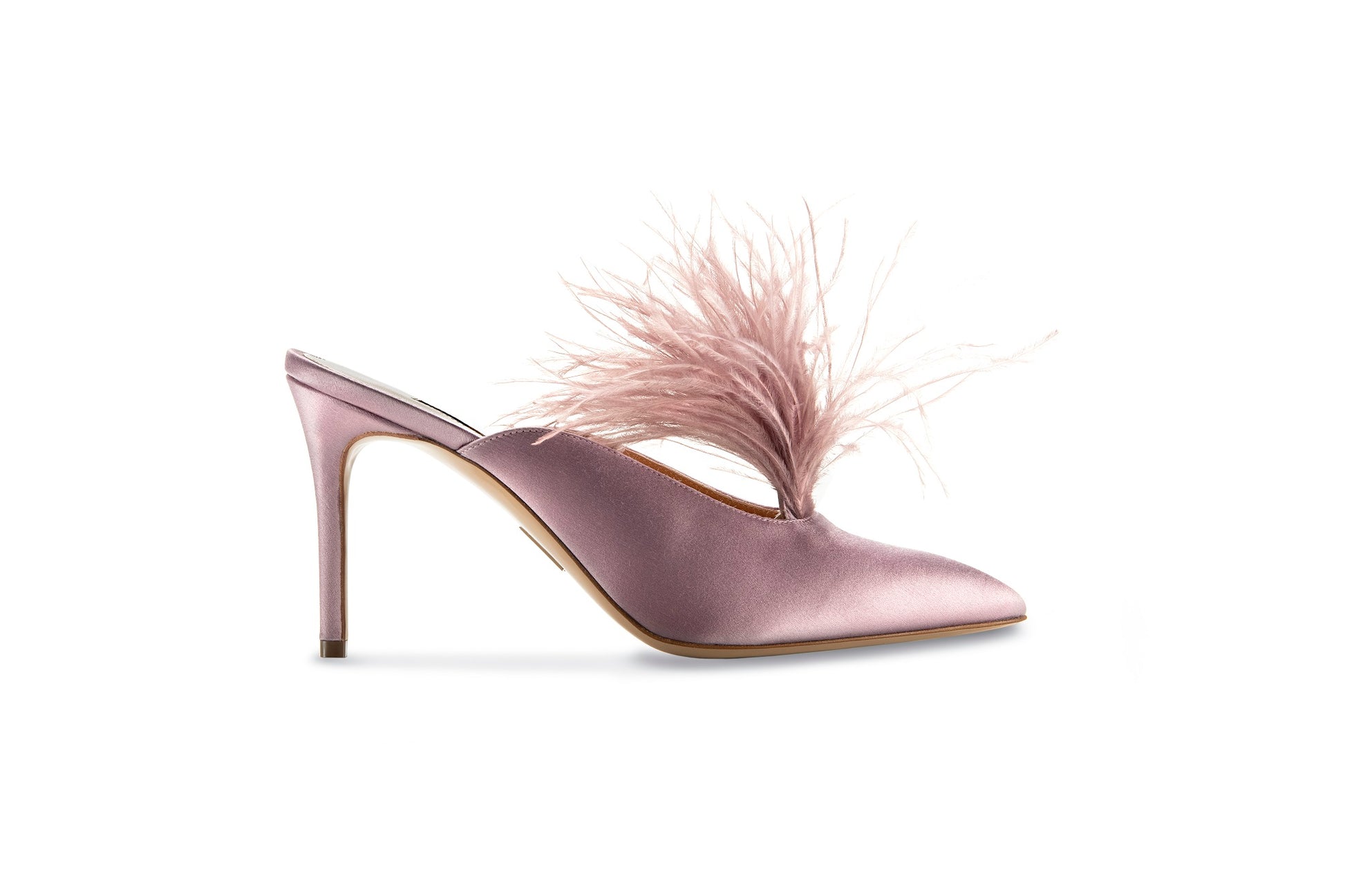 powder silk and matching powder feathers / leather sole and insole / Heel height: approximately 8.5cm / Italian Fit / True to size