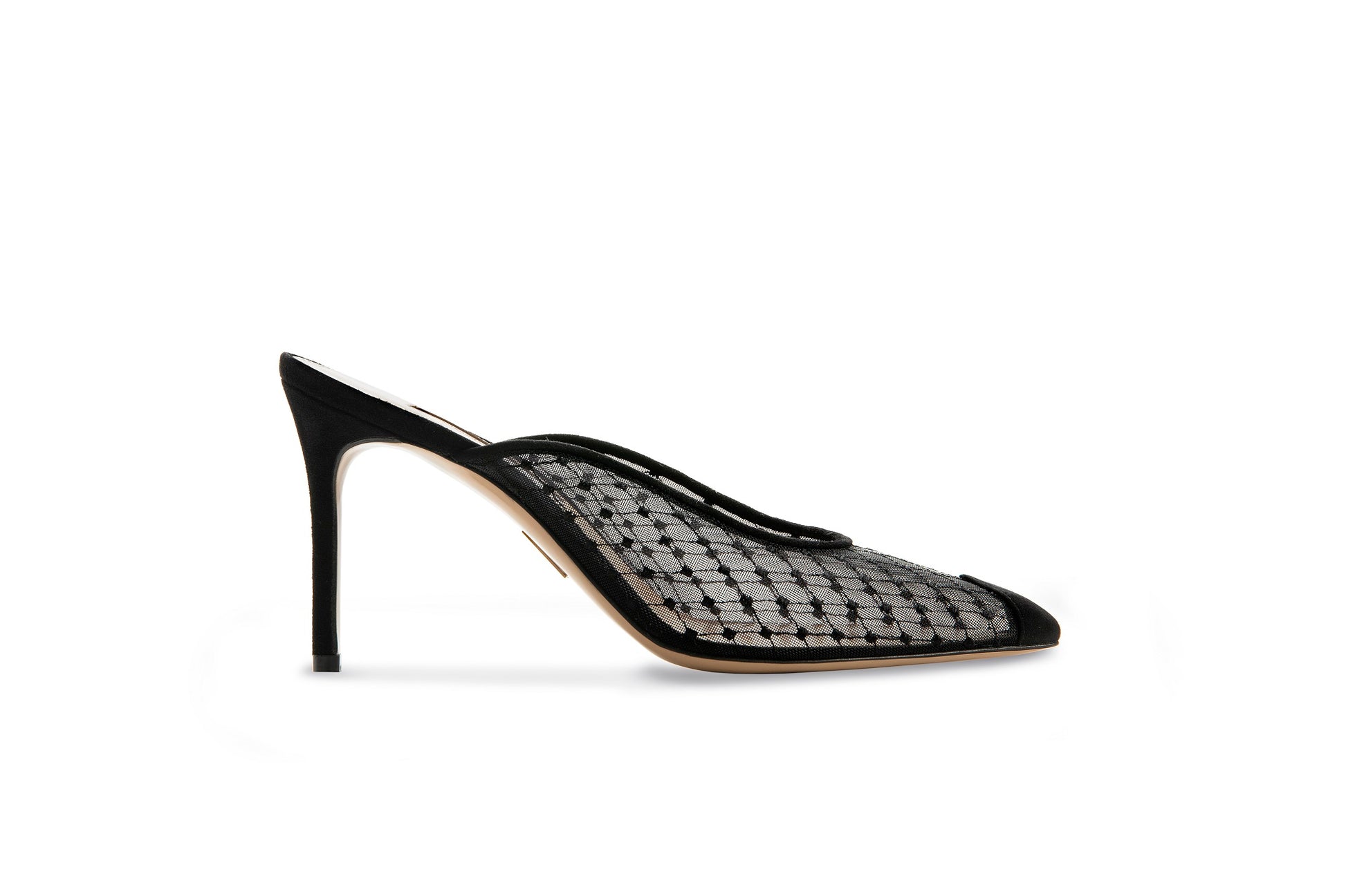 The Juliette mule in black losang net features a rombo front pointy mule made of suede and a black suede heel.