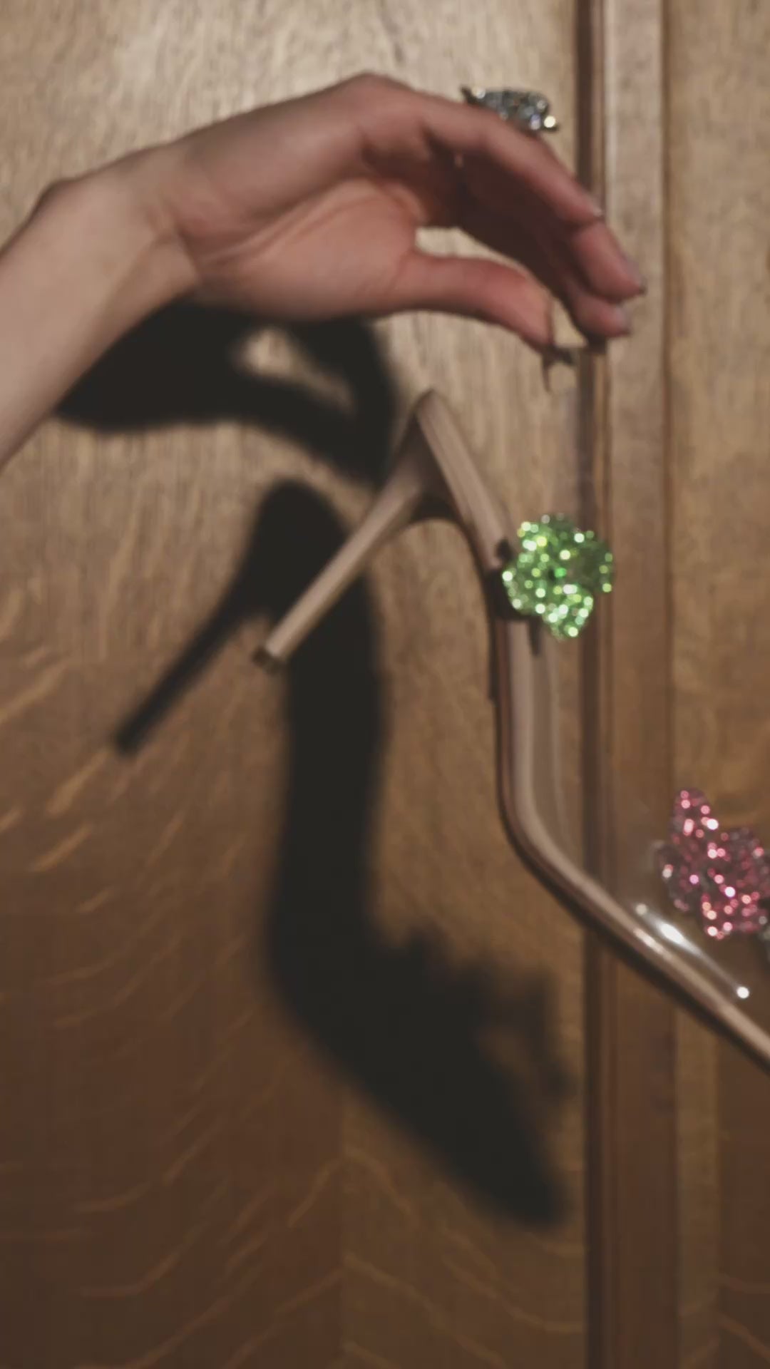 Clear PVC, nude patent leather and light yellow-rose-mint crystal flower embellishment / leather sole / leather insole / signature A logo / Heel height: approximately 8.5cm / Italian Fit / We suggest taking half size or one size up than your true size