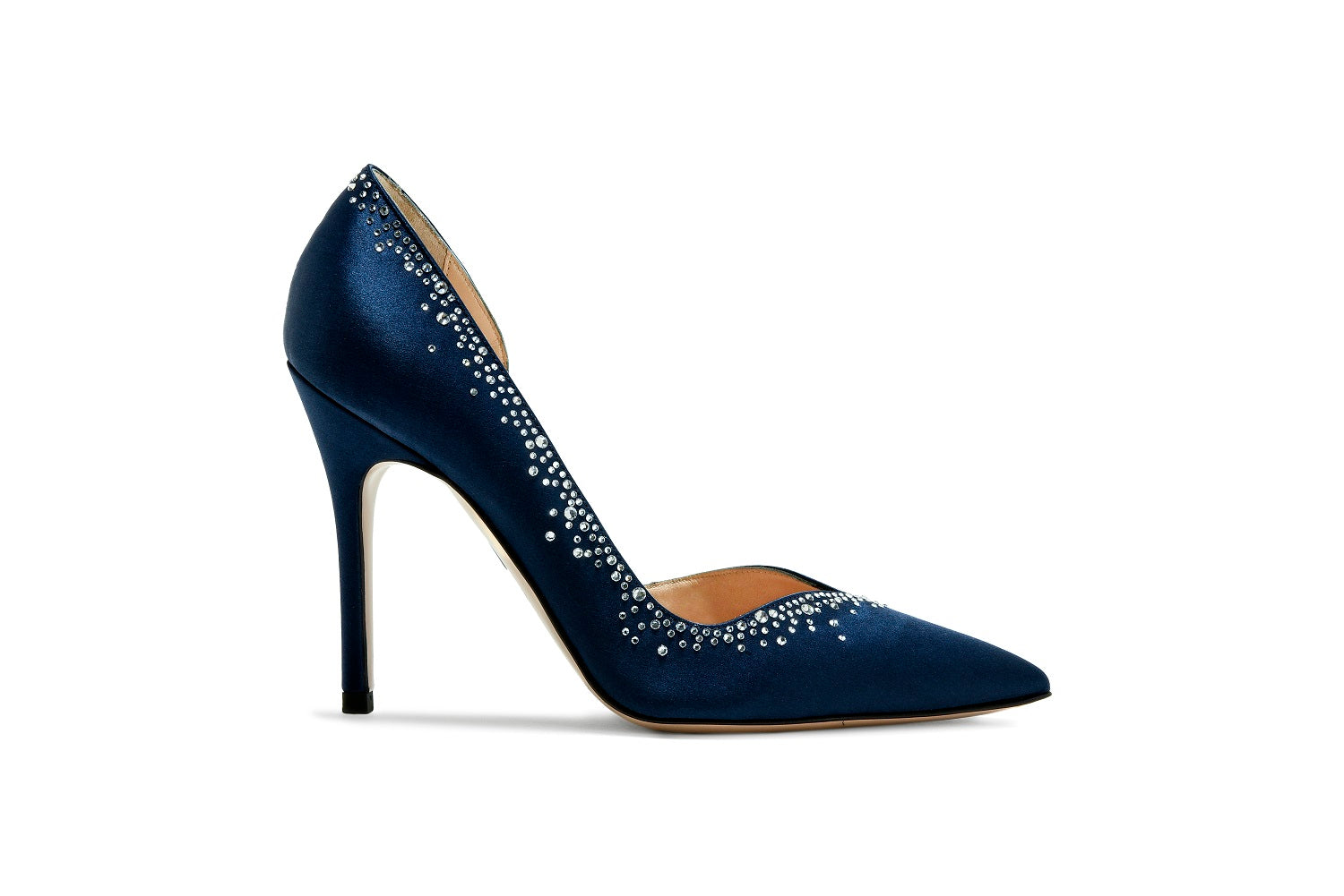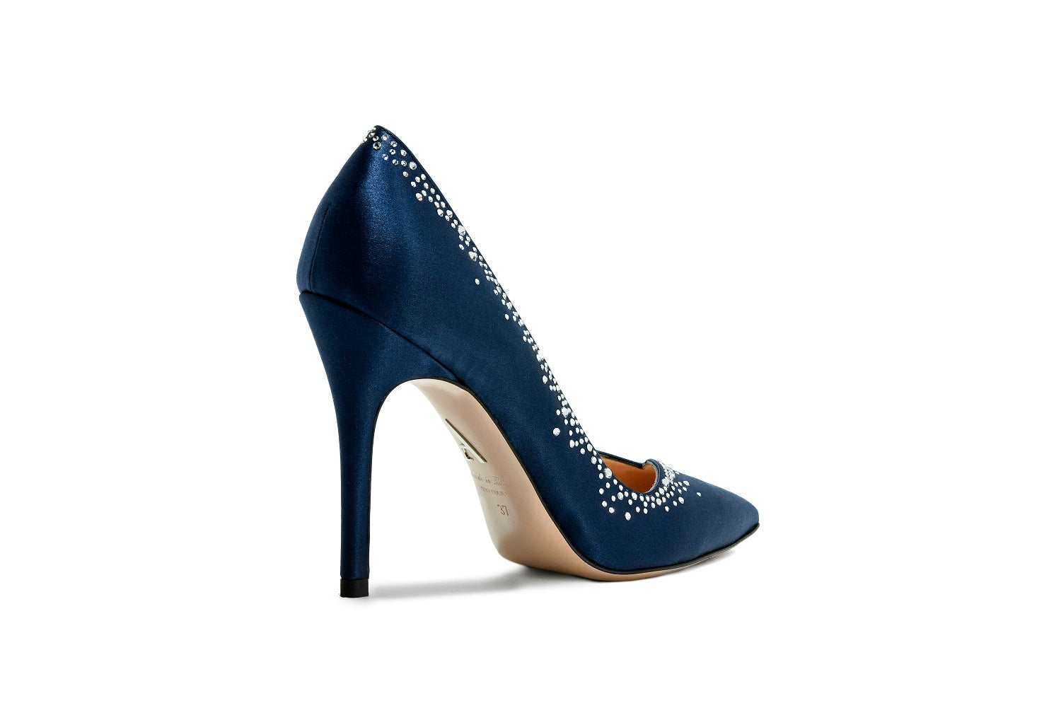 Midnight blue satin and Swarovski embellishment / leather sole and insole / Heel height: 10.5cm / Italian Fit / True to size