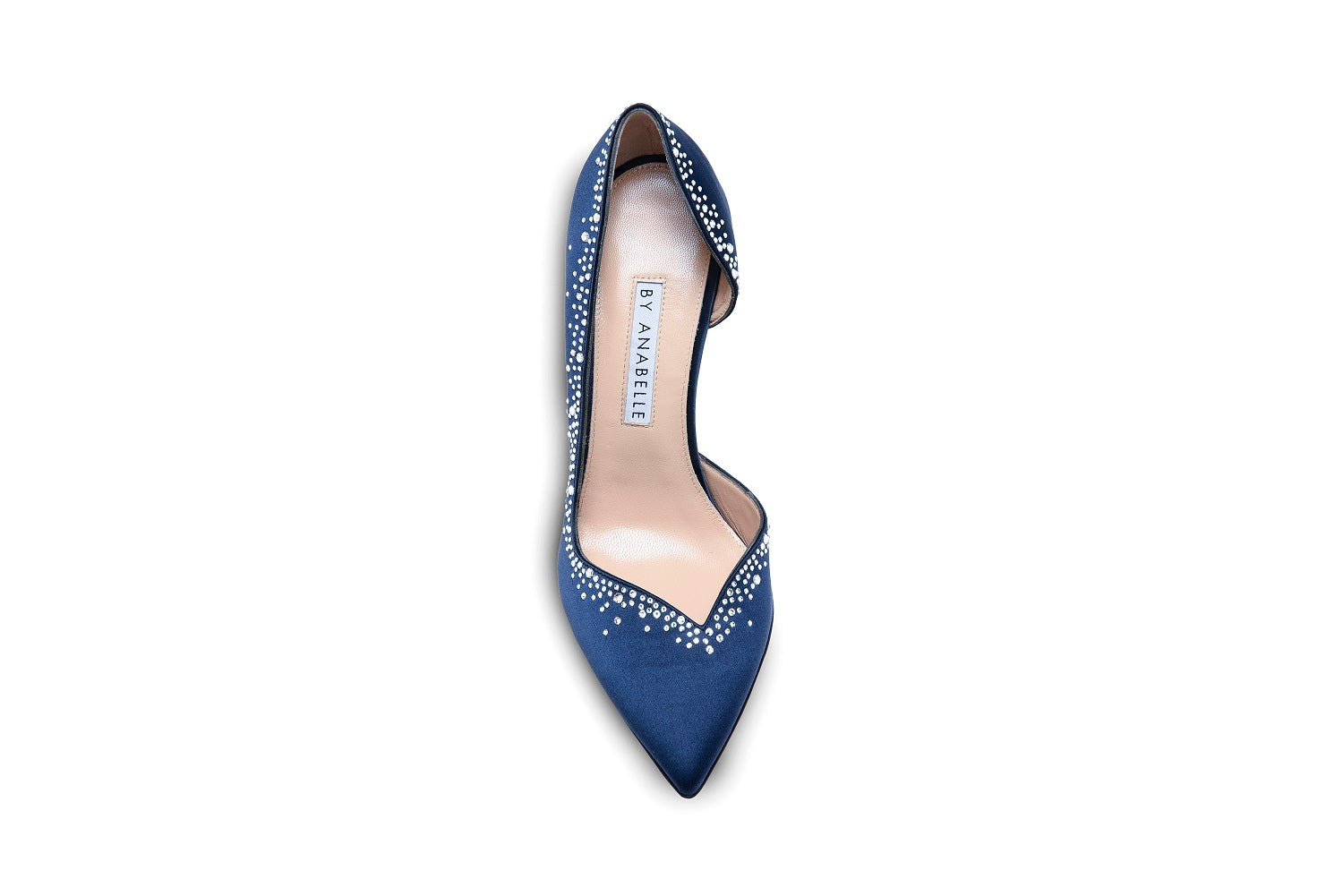 The Ti Amo Pump in Midnight blue silk satin featured an a-symetric heart shaped pointy toe and Swarovski embellishment throught.